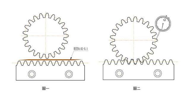 方法1、如圖一齒輪和齒條咬合時放入我們所需的間隙厚度的銅箔片,例如0.02mm厚度的銅箔片,在給齒輪一定的預壓力,使得齒輪和齒條的壓緊,再推動齒輪轉(zhuǎn)過銅箔片,最終我們得到的間隙是0.02mm左右。