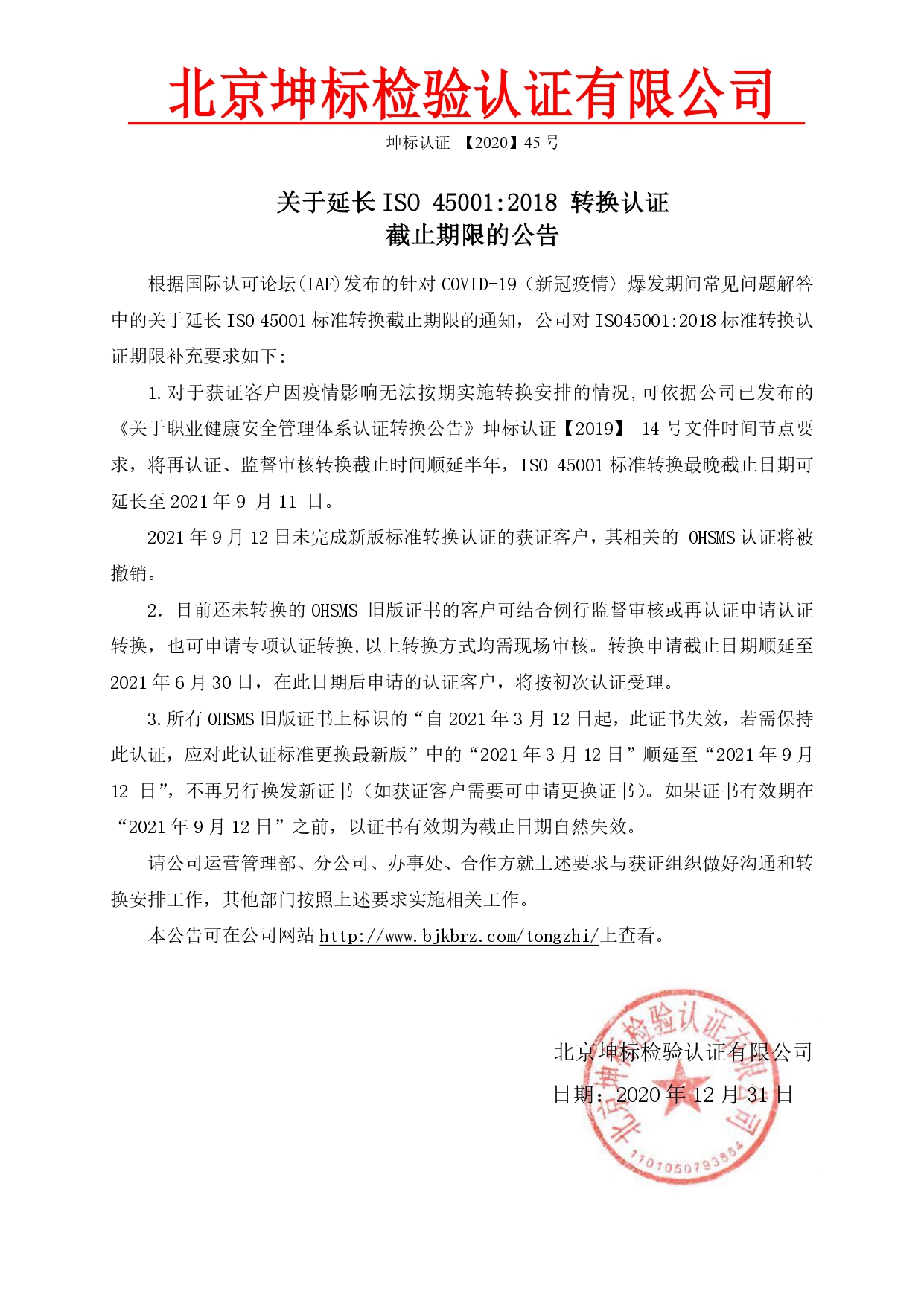 關(guān)于延長 ISO 45001:2018 轉(zhuǎn)換認(rèn)證 截止期限的公告